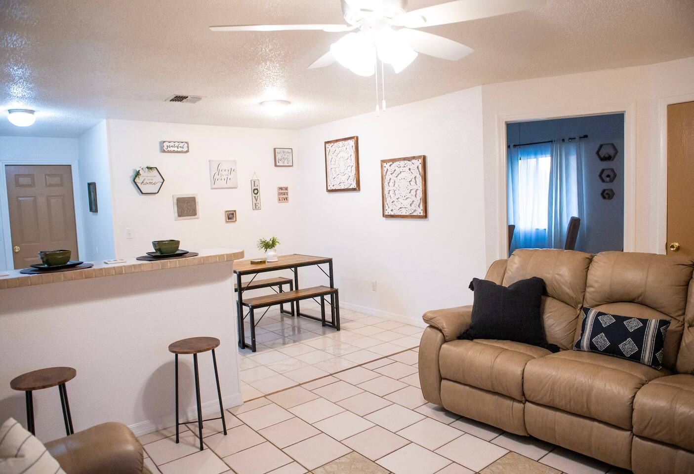 KEY FEATURES: ☀ 3 cozy, well-appointed bedrooms with queen and single beds ☀ 2 full bathrooms with classic fixtures and soaking tubs ☀ Fully equipped kitchen with modern appliances and a breakfast bar ☀ Comfortable open-concept living room with plush seating and massive flat-screen TV ☀ Expansive, fenced-in backyard with patio ideal for BBQ, pets and outdoor relaxation ☀ Unique curved driveway with on-site parking ☆☆ BEDROOMS ☆☆ Each of the three inviting bedrooms is designed for restful nights and peaceful mornings. Featuring a mix of queen and single beds, soft linens, bedside tables, and reading lamps, you’ll find the space both functional and serene. ☆☆ BATHROOMS ☆☆ With two full bathrooms, getting ready is easy. Enjoy contemporary fixtures, spacious vanities, a walk-in shower and a large bathtub perfect for a refreshing soak or a quick rinse after a day of adventures. ☆☆ KITCHEN & LIVING AREA ☆☆ The open-concept kitchen and living area is the heart of the home. Prepare home-cooked meals in the fully stocked kitchen, featuring stainless steel appliances, a breakfast bar, and all the cookware you need. Then kick back in the cozy living room with plush seating and a large flat-screen TV, perfect for movie nights or quiet evenings in. ☆☆ OUTDOOR SPACE ☆☆ This outdoor space is ideal for morning coffee on the patio or unwinding under the stars. The yard is completely enclosed, making it safe and secure for kids or your furry friends to roam freely. We’ve added cozy outdoor seating, BBQ grill, and plenty of green space to stretch out and enjoy. Whether you're looking for a quiet spot to read a book, a place to let the dog run, or just some fresh air between adventures, our backyard is your personal retreat.